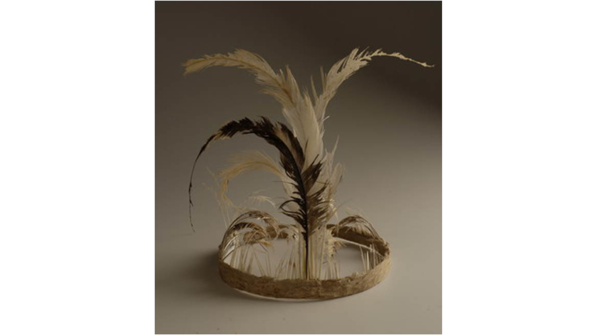 Tocado o cintillo parte de la vestimenta típica del Pueblo Rapa Nui (Isla de Pascua), elaborado en mahute, (fibra vegetal), coronado con plumas de aves marinas de colores blanco y negro.